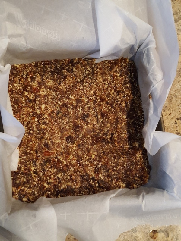 • Spread this mixture as a second layer on top of the date and pecan crust. Lastly, add a sprinkling of crushed pecans on top.